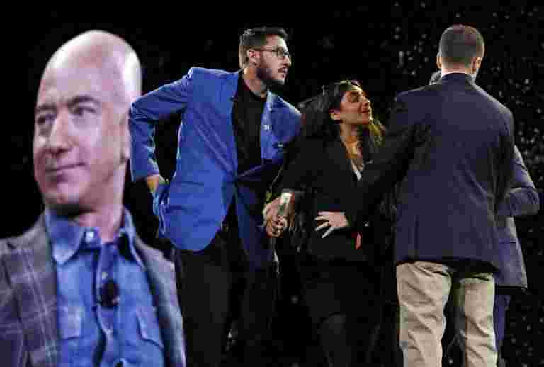 當局表示,在接近亞馬遜首席執行官和創始人Jeff Bezos后,一個女人在接近亞馬遜首席執行官和創始人Jeff Bezos并對拉斯維加斯的會議上的舞臺上大吼大叫。在亞馬遜的貝奧斯的外觀:雅典度假村的火星活動在婦女被保安人員包圍并迎來了迎來了。