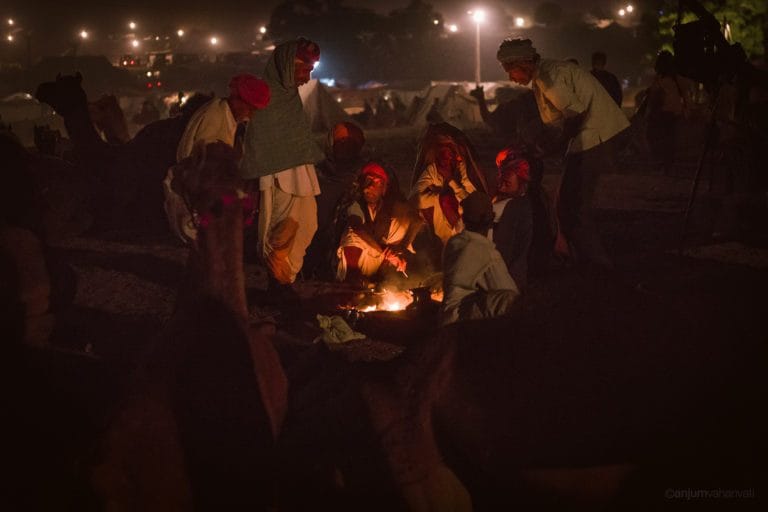 人們在普什卡駱駝博覽會的篝火前暖和的人們,拉賈斯坦邦。照片由A. Vahanvati / Wikimedia Commons。