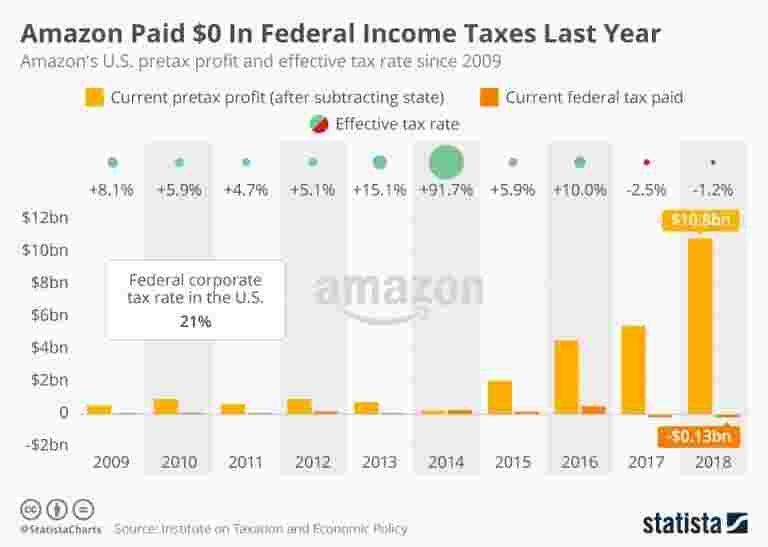 盡管利潤加倍,但亞馬遜連續第二年舉行,亞馬遜在聯邦稅收上支付零美元。這根據稅務和經濟政策研究所上周發布的報告,這提出了關于技術巨頭的稅收習慣的嚴重問題。2017年,其稅前利潤為56億美元,去年他們飆升至112億美元。美國法定所得稅稅率為21%,亞馬遜報告了1.29億美元的所得稅退稅。以稅率為-1.2%的稅率。